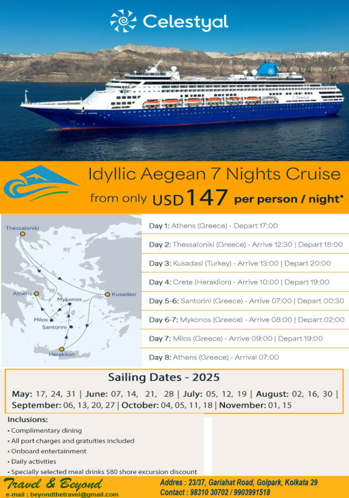 Idyllic Aegean 7 Nights Cruise CelestyalHere’s a visual glimpse of the "Idyllic Aegean – 7 Nights" cruise by Celestyal Cruises, showing the journey’s Aegean route.